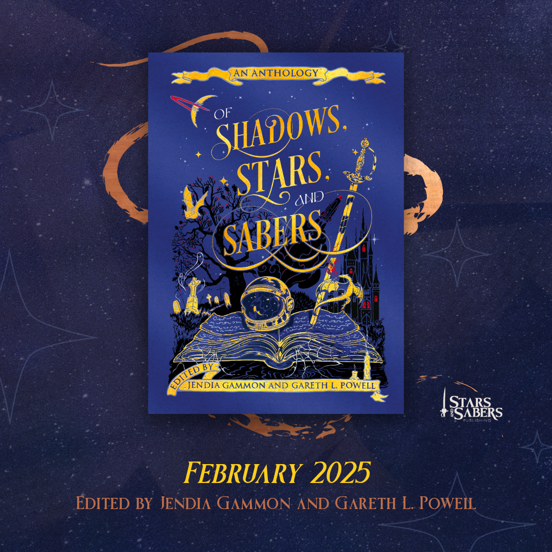 In our first week of launching Stars and Sabers Publishing, we had many fun events. The first, of course, was the cover reveal of our wonderful anthology, Of Shadows, Stars, and Sabers, edited by Jendia Gammon and Gareth L. Powell.